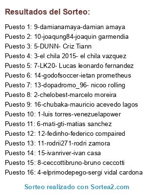 Lista de participantes: 1-luis torres-venezuelapower, 2-chelobest-marcelo moreira, 3-el chila 2015- el chila vazquez, 4-elprimodepego-sergi vidal cardona, 5-DUNN- Criz Tiann, 6-mati-gti-matias sanchez, 7-LK20- Lucas leonardo fernandez, 8-ceccottibruno-bruno ceccotti, 9-damianamaya-damian amaya, 10-joaqung84-joaquin garmendia, 11-rodrii271-rodri zamora, 12-fedinho-federico compaired, 13-dopadromo_96- nicoo rolling, 14-godofsoccer-ietan prometheus, 15-ivanriver-ivan casa, 16-chubaka-mauricio acevedo lagos.