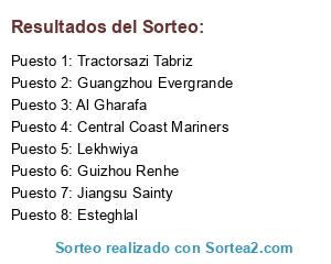 Lista de participantes: Central Coast Mariners, Al Gharafa, Lekhwiya, Guangzhou Evergrande, Guizhou Renhe, Jiangsu Sainty, Esteghlal, Tractorsazi Tabriz.