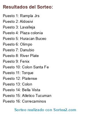 Lista de participantes: Danubio, Huracan Buceo, Rampla Jrs, Colon, Colon Santa Fe, Bella Vista, Olimpo, Fenix, Aldosivi, Plaza colonia, Platense, Torque, Correcaminos, Atletico Tucuman, River Plate, Lavalleja.