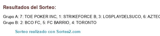 Lista de participantes: 1: STRIKEFORCE B, 2: BCO FC, 3: LOSPLAYDELSUCO, 4: TORONTO, 5: FC BARRIO, 6: AZTEC ESPORT, 7: TOE POKER INC.