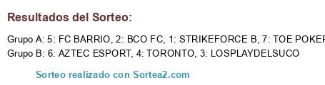 Lista de participantes: 1: STRIKEFORCE B, 2: BCO FC, 3: LOSPLAYDELSUCO, 4: TORONTO, 5: FC BARRIO, 6: AZTEC ESPORT, 7: TOE POKER INC.