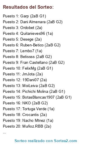 Lista de participantes: Muñozrbb (2a), Senver (2a), Ordobet (1a), Parse (2aB G2), Tryphon Ivanov (2aB G1), ManuelArahal (2aB G2), Marco Ramirez (1a), Elcapa (2a), EduBetis (2a), Carne con Tomate (2aB G1), JuanpeBarna (2a), Quitanieves (2aB G1), Barksdale (2a), Pichichi Molina (2aB G1), Nacho Mtnez (1a), Vitillo (2aB G2), Jlas (1a), Humphrey Bogarth (2aB G2), Beticon (2aB G1), Dani Almenara (2aB G2), Betissss (2aB G2), German (1a), Crocantis (2a), Ajora (2aB G1), Pablo Romo (2a), Garp (2a).