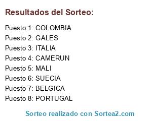 Lista de participantes: PORTUGAL, MALI, ITALIA, BELGICA, CAMERUN, GALES, SUECIA, COLOMBIA.