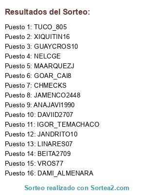 Lista de participantes: ANAJAVI1990, BEITA2709, CHMECKS, DAMI_ALMENARA, DAVIID2707, GOAR_CAI8, GUAYCROS10, IGOR_TEMACHACO, JAMENCO2448, JANDRITO10, LINARES07, MAARQUEZJ, NELCGE, TUCO_805, VROS77, XIQUITIN16.