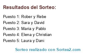 Lista de participantes: Rober y Rebe, Sara y David, Maria y Pablo, Laura y Dani, Elena y Christian.