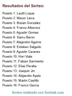 Lista de participantes: Franco Garcia, Santiago Amaya, Alejandro Aguirre, Samu Beron, Agustin Gomez, Alejandro Ayala, Elias Peralta, Franco Albornoz, Braian Gonzalez, Mauro Leiva, Esteban Salgado, Martin Castillo, Agustin Caceres, Joaquin Jm, Hori Viale, Lautti Luque, Fabian Sarmiento.