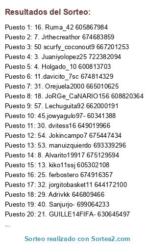 Lista de participantes: 1. Jokerplay767 665408275, 2.fracrack_ 611054608, 3. Quinicamas 633762851, 4. victormcf94 633748221, 5. racso_2299 661665474, 6.The_assasin_Rixi 635808043, 7. Edwin_1990 634621422, 8. Tinococalo 661935162, 9 neurothik 618929511, 10. carlos2646 681330920, 11 futbolpro2017 658453253, 12 Lalex922 696519496, 13. Ripoll7 600680502, 14.ale181292 636140105, 15. Dezanos12 655194817, 16. Jose_Miguel_611 625086049, 17. ferbostero 674916357, 18.danipala_99 654952844, 19. POYIKO11 651554710, 20.adryan3_3 651035992, 21.Jrthecreathor 683238292, 22.futbolin_carlos:672774813, 23. OscarrBL21 - 672782933, 24. AdrigfD10S - 722148730, 25. XxJaviMvxX - 697804216, 26.Xurrito99- 648983704, 27.Alpabarrio- 603432868, 28.botella94 - 616085510, 29. AlvaroGranero- 633750710, 30.Alexx_15 / 644364762, 31.Aleehdeez01 / 685142756, 32. Mutombillo99 - 615681961, 33. Juaniyolopez25 722382094, 34. Oxkyzz - 648613450, 35. raul_coman2000 - 638402552, 36. Pelotazo_atinado 651453745, 37. FIFA_beltri-666573082, 38. MUGIWARA18LUFFY 658187977, 39. paufede8 - 649559852, 40.roberttosierra6 - 662575045, 41. Alexilloo23- 606674901, 42. Sergi_Rubio10 633318673, 43. HIKERRES11 - 677338460, 44. Garciia10 - 676850579, 45. manuizquierdo - 693339296, 46. YassRabhi8- 722212044, 47. Adriansanjurjo10 699064233, 48.resi_94mtz 665459429, 49. Sir_pereira23 689502054, 50. Cundermen 650604091, 51. Jokincampo7 675447434, 52. German1046- 626294001, 53. Chorizo_nulo69- 665030049, 54. RGalleego - 674940465, 55. ajaa_21- // 622795907, 56. Yeraiguiu2311/ 673721165, 57. Tusmuertos092 674964461, 58. eljaba1604 - 626979051, 59. luisocas9 - 655873366, 60. dvitess16 - 649019966, 61. Chanclas97 - 644779300, 62. Bixxuu - 670882364, 63. Hector - 612523470, 64. Jerome - 618929511.