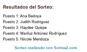 Lista de participantes: Milena Zapata, Jessica Nuñez, Isabel AF, Raquel Rua, Karen Solis Dimas, Lizeth Muñoz Mendoza, Yameli Claudia Huertas Villaorduña, Grisell Effio, Rosa Maria Capella, Tania Angulo, Jossely Neyra, Sukami Rafael, Kelly Muñoz, Angelita Mendoza Latorre, Giuliana Ahuate Cabrera, Cynthia Santiago, Doris Isabel Morales, Monica Vargas de Almeida, Fiorella Corina, Carmen Yaipen Garnique, Denisse Contreras, Katty Mundo, Edith M. Díaz, Gliset Dionicio Yarin, Elizabeth Miranda Ramos, Lucy Vilma Roca Berna, Gina Sanchez Carhuamaca, Keyla Juanita Lucana Pereda, Natalie More H, Melissa Enciso, LeyLa Medina Aguilar, Diana Yudit Hernandez Bazan, Jessica Avila Ponce, Evelyn Gutiérrez, Sendy Rojas Silva, Cecilia Abanto, Sandra Guadalupe, Dory Ramirez, Giovanna Ccaccyalla Cuadros, Daniela Aracely Seclén Barreto, Tati Zs, Karen Ulloa, Gisela Susu MP, Tere Tapia, Hilda Pari Cruz, Judith Barrios, Damaris Huamani Osco, Judit Bebi, Zelly RA, Diana Q Vil, Alflo Patty, Gisella Angulo García, Giova Pintado, Leandra Rosales Espinoza, Fernando Yonathan Bustamante Mattos, Miguel Chavez Martinez, Cinthia Ruby, Subcafae Ugel, Josselyn Yssel CB, Jennifer Sofia Prado Caballero, Laura Duràn, Patricia Ruiz, Alicia Quispe Moyano, Soffy RamosEsp, Diana Espinal, Graciela Espinoza Sullca, Juany Rosal, Zulma Zacarias Segura, Mirella Lache, Myrian Guevara Paz, Kathy Cule Loayza, Gabriela Segovia, Annyta Anny, Pame TC, Liset Veronica Flores, KaTe Nt, Yosi Andrea Huapaya Capcha, Aleyda Camas Zagaceta, Perla Dorina Montalvo Sanchez, Rosario Edith Urbina Araujo, Aida Gabriela, Vargas Baez Enma, Marynils Bernabe Ybarra, Jrh Janetrh, Sofí del Río, Jackie Nájera, Luce BC, Rubi Delgado, Giovana Granados, Erica de la Cruz, Gloria Ruth Torres, Carolina Diaz, Lisset Sandoval, RoCa Jim, Silvana Elizabeth Cama Cruz, Martha Asmat Monsante, Maria Conde, Eventos Decofrutal, Haydee Quispe, Ericka Caceres, Angélica Riquelme Villarán, Katiuska A Osorio, Mari Cerdan, Annel PM, Jenny VT, Jhetsyn Aki Rojas Flores, María Del Carmen Prieto, Blue Delacour, Elizabeth Guerra, Niicole Mendoza, Fanny Ramos Yaya, Deysi Alejos, Lesly Rodriguez, Guiovana Yccasai, Veronika Perez, Rocio Bravo, Tabata Milagro Valerio Hidalgo, Paula Chavarri, Deysi Masco Moreano, Leissy Liseth Franco Villani, Roxana Gutierrez, Joana Sabastizagal, Milagros Stephanie Prado, Lu Isa Mamani, Mila Echenique, Carolina Arce, Ana Bedoya, Susana Astete, Johany Vasquez, Katherinne Lopez, Giova Ramos, Milagros Cappa, Liliana Ochoa, Rocio EQ, Ale Otiniano, Doris Huaman Carnero, Carla Isabel Chávez, Fiorella BP, Verito Jazmin Bravo, Gio FS, Sonia Perez, Ivette Ramos, Jenifer Lima Contreras, Myriam Sg, Chiara Melissa, Varu Salas, Marita Velez, Mahily Arenas Terrel, Jennifer Ruiz, Ana Vera Castillo, Vannessa Elizabeth Sosa Vergaray, Patricia OM OM, Marivel Barrios, RG Mercedes, Rosa Beatriz Hernandez Medina, Maria Cynthia ESpiritu Acuña, Oh Mo'n Dieu, Emmy Zea Castillo, Nataly Sotomayor Huamani, Rocío Jurado, Silvia Lucero Tafur, Sabrina Mendoza Rivera, Mirian Enciso, Yenny Balbuena, Araceli Noe Quiroz, Elisa Perez Uriarte, Paola Castro Cèspedes, Malenita Cruz Jara, Roxana J. Ariste, Luly Paz Andrade, Maria Silvia Martinez Zegarra, Cora Ninel Antezana Bendezu, Rina Laureano, Maria Reina, Meli Mattos, Patricia Ezcurra, Claudia Johanna Barrantes Zelaya, Denisse Villaorduña, Ana María Gala, Elizabeth Cortez Fuster, Sheila Campos Pulido, Renee Rosales Tafur, Fatima Giron Murga, Isabel Coni Salcedo Porras, Gabriela Cruz Paredes, Rocio Alvarez Maita, Jenniffer Espinoza, VIckasi Kv, Maryclerk Gómez Jancachagua, Silvita Santamaria Ch, Yenifer Flakys, Erika Velez, Giovanna Ramos Escalante, Veronica Viva, Marianella Chuica, Clemencia Mejia Hu, Teresa Cáceres Barrón, Patricia Huaman Meneses, Maria Peñaloza Cordova, Sonia Puertas Sotelo, Estefany Quispe Quispe, Claudia Tarmeño, Luzuriaga Gaby, Giannina Castañeda, Jessi Solano, Magaly Alegria, Rocio Plata, Tatiana Cornejo, Soraya Sáenz, Andrea Bennet, Mirian Graciela Rodriguez Sifuentes, Jenny Vare, Rosa Carvajal de Villacis, Rosibel Montiel, Glenda Karim, Mariluz Antúnez Rodríguez, Faviola Rivera Espinoza, Karina de Taquía, Kelly Bonilla, Yoysi Rivera, Angie Miranda Vargas, Sara Villon, Diana Zuloeta Villanueva, Cristel Paredes Sanchez, Ana Vivanco, Monica Cabanillas AngelesSusan Condori, Elizabeth Obregón, YeLi Sanchez Ä #CamilaViali, Fiorella Chinchay Tejada, Vilma Choque, Kalumi Kassilú, Gilde Toro Ruiz, Leonela Gomez De Zambrano, Caroll Miranda Gonzalez, Judith Rodriguez, Hilda Mirian Nolazco Ramirez, Sully Salazar Kikukawa, Deysi Salomé Verástegui, Rosa Peña Cabrera de Estrada, Antu ZT, Anna Burgs, Shey B Ch, Diana Antinori #CamilaViali, Gabrielita Verita Tello Amo, Sonia Portocarrero, Lizet Aray, Rosita Alava, Erika Gina, PAz Css, Paula Leon, Sandra Velásquez Olano, Karen Arce, Yanina Yanina, Yenny Milag, Ivonne Bermudez, Lai Keli, Elsy Gaby Sanchez Sanchez, Liz Valera, Elisa Sanchez Galicia, Rosario Santa Cruz Cárdenas, Esperanza Palacios, Dalila Sanchez, Kate Suyón, Janette Marisol Montoya Velarde, Evelyn Cristina Diaz Guevara, Rosy Rios, Patricia Bautista R, Cantaro Giraldo Llulliana, Mary Ales, Silvia More Aguilar, María Tasayco, Talía Dalíz Llanca Cotrina, Karinita Campomanes Blas, Rocio Mendoza Pariona, Nadit Cristina Godoy Cupi, Roxana Puccio Alvarado, Giliz EC, Yelina Osorio, Julissa Karina Maricahua Maricahua, Luciana Mashiel Quiroz Nieto, Naomy Quiñonez, Julissa Rojas, Katherin Rodriguez, Maria Del Carmen AnDiaz, Elia Paz, Edith Corahua Ventura, Milagritos Saona Torres, Roxana Laura #Ca, Mercedes Tipan, Miriam Reyna Viena, Liliana De Carlos Xmc Shiirley, Elisabeth Miranda Luyo, Joselyn D Fortty, Laura E Nuñovero, Carmencita Lopez Polo, Elena De Jesus QS, Venus Hernández Rodríguez, Marinita HR Rivera, Stefania Diaz Castillo, Mila Verástegui, Brenda Haro de Pérez, Evelyn Rafael Bueno, Alicia Herencia Ortega, Karla Casas, Mishishita Tinoco, Andrea Alvarez, Silvia Paiva Roca, A