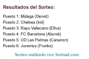 Lista de participantes: FC Barcelona (Abundi), Chelsea (kid), Málaga (Deivid), UD Las Palmas (Canarion), Rayo Vallecano (Elfus), Juventus (Fronko).