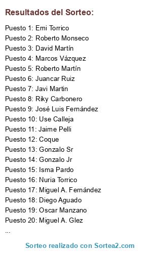 Lista de participantes: Miguel A. Fernández, Riky Carbonero, Agus Velasco, Emi Torrico, Use Calleja, Javi Martin, David Martín, Nuria Torrico, Isma Pardo, Roberto Monseco, JA Vidania, José Luis Fernández, Jaime Pelli, Ballesteros, Marcos Vázquez, Gonzalo Sr, Gonzalo Jr, Diego Aguado, Coque, Jorge de Gea, Juancar Ruiz, Miguel A. Glez, Roberto Martín, Oscar Manzano.