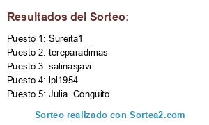 Lista de participantes: salinasjavi, tereparadimas, LordCalabazas, Julia_Conguito, Er_Feliz, Sureita1, finivc, vvid7, emilio987, cinedincidan, lpl1954, RafaeldeCadiz, JoseZenda.