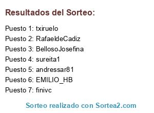 Lista de participantes: txiruelo, VMILAN77, Emilio987, EMILIO_HB, BellosoJosefina, nadaterreno0x0, lucaspv78, migperez63, andressar81, Er_feliz, finivc, sureita1, RafaeldeCadiz, lpl1954, traskilita51, falialva52, pepelucapi.