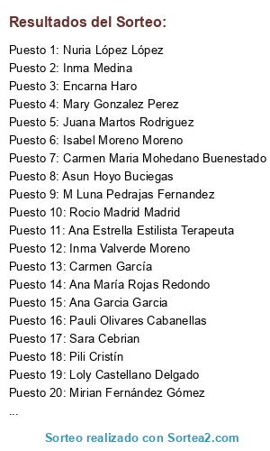 Lista de participantes: Loly Bejarano Rodriguez , Cristina Calvo , Inma González Jurado, Paula Migallon Redondo, Guía GB , Maria Jose Hidalgo Cobos, Ana López , Cristina Fernández Buciegas , David Benitez Delgado, Mary Serrano López, Remedios Jurado Peñas , Rosario Cruz Martinez , Mary Jaut Rico, Laura Ortiz López, Teressa Madrid Gil, Nieves Jurado García , Vero Jaut Rico, Ana Garcia Garcia, Amanda Morales, Laura Moreno Ruiz, Bernabela Cruz Dueñas, Manuel Aranda Díaz, Toñi Sg, Kati Rubio, Maria Nicolas, Eva Mesa Cabrera, Victoria Castro López, Alicia Hoyo Martin, M Luna Pedrajas Fernandez , Laura Vilches Sicili , Joana Nevado, Juani Fernandez Gutierrez, Maria Jose Valverde Gomez, Inma Valverde Moreno, Elisabeth Pontes Martínez , Fani Ruiz Peralvo, M Carmen Blazquez Rodriguez, Lurdes Cobos Cristin, Mary Cuenca, Eva Jiménez Márquez, Susana Ruiz Tribaldo, Maria José Valverde Moreno, Sonia Garrido Moya, Rafi Aperador Tena , Sandra Valverde Gomez , Fatima Peralvo , Inma Peinado Jurado , Josefita Moya Alcudia, Sara Cebrian, Azahara Manjón García, Mari Angeles Redondo Moreno , Claudia Alcalde Peinado, Pili Cabrera Moreno, Maria Del Mar Muñoz Cabrera, Montserrat Madueño , Laura Lunar, Ascensión Jaut Blanco, Antonia Maria Gomez Garcia, Rafi González Pedrajas , Mati Fernandez Cruz, Monica Espejo Alcalde, Marta Naranjo Viñas, Mayte Cabrera, Toñy Herruzo Garcia, Carmen Romero, Raquel Castro Molina, Alicia Lopez, Chiqui Vioque, Isa Sainz Rodriguez, Amelia Calero Aguado, Vidal Calero Moreno, Lucía González Madueño , Isabel Mena Cobos, Sara Gonzalez Madueño, Mar Moreno Lopez, Maria Jose Cobos , Ana Reyes García Redondo, Cristina Cardador, Isabela Caballero Herrero, Paqui Amor, Ana Belen Risquez Madrid, Estefania Fany, Ana Cebrián Herrero, Rocio Madrid Madrid , Ana María Rojas Redondo, Ascen Bravo Calero, Esperanza Macarena Cristín Mora, Angie Rodriguez , Ana Morales, Eli Benitez Lopez , Encarna Haro, Maria De Los Angeles Garrido Leon, Ana Estrella Estilista Terapeuta, Laura Misas Marquez , Tere Barrios Espejo , Maria Isabel Rojas Peña, Cristina Bleda Serrano, Susana Peinado Marquez, Jessica Rubio Fernández, Maria Alegre Mantas, Maria Del Mar Caballero Herrero, María Peña López Castro, Ana Cantero Redondo, Ana Llergo Amor , Silvia Sanchez Risquez, Veronica Martinez Limens, Maria Segador Romero, Elvira Romero Rojo, Nuria López López, Sara Cabrera Pastor, Cristina Márquez Jurado , Guia Rubio Palomo, Marta Crespo Campos, Ana Cristina Lopez Ramirez, Gregorio España Aguilera, Emiliano Pozuelo Moreno, Paqui Cabrera , Rocio Caballero, Nazaret López Ramírez, Manoli Pastor Gomez, Rafi Carrillo Regalón, Isabel Carrillo Regalon , Toñii Lopez Romero , Loli Vc , Milagro Milagro , Veronica Diaz Serrano, Miguel Angel Buciegas Sanchez, Cristina Sánchez, Maribel Pastor, Cloty Sanchez Garcia , Esperanza Pedrajas Fabios, Yolanda Cano Priego, Elena Molina Garcia, Lydia Chico Sanchez, Dolores Garcia , Isabel Torrejon, Angela Marquez Jurado , María Rosa Cabrera , Carmen Muñoz Jurado, Luz Marina Mesa Cabrera, Conchi Cobos Sepulveda , María José Lopez Moya, Ana Benitez Lopez , Elvira Merino Alcalde , Bogado Raquel, Karen Calero, Anita Surferita, Josefina Gonzalez Sepulveda , Amparo Buciegas Fernández, Mirian Fernández Gómez, Andrea Sanchez , Alba Araujo Muñoz, Familia Rodríguez Bertani, Alba Encinas Pedroche, Maria Victoria Gomez Gascon, Ana Belen Lopez Aguado, Ana Maria Muñoz Moreno , Conchi Fernández Cruz, Eu Romero , Cata Carg, Mary Rmc , María Madrid, Pilar Cabrera Gómez, Asun Hoyo Buciegas , Ana Belen Nevado Romero, Loli Rubio Frutos , Maru Nosé Quemás, Rafi Medina Alcudia , Paqui Ruiz Sanchez, Laura Gómez Jurado, Mari Emi Risquez Perea, Mari Luna Fernandez Risquez, Maria Luisa Castro Galvez, Rocio Lopez Tobajas, Rosa Lopez, Angelina Pontes Murillo, Anabel Sepulveda Alfaro, Monika Silveria Lopez , Charo Rodríguez Cornejo, Estefania Silveria López , Rossy López, Maria Jose Acedo Agredano, Rosa Moreno Cepas, Katy Jaut Fuentes, Rosa Martín Moraño, Ely Reche Cabanillas, Luna Ruiz Fernandez, Carmen Maria Rubio Mantas, Maria Del Rocío García, Luna Ramirez Pozuelo, Almu Muñoz Díaz , Iluminada Troyano Murillo, María Barea López, Carmen Maria Mohedano Buenestado, Leonor Cerro Redondo , Rocio González Cabreraa, Estefania Caballero López, Carlos J Moreno, Carmen Maria Linares Fuentes, Bienve Fernandez Moreno, Fuen AS, Maria Del Mar Jurado Ruiz , Amparo Borreguero Rubio, Carmen Cabrera Gaitan, Conchi Flores Almena, Ascen Bejarano Cerezo, Inmaculada Gómez Rodríguez, Basi Moreno Díaz , Inmaculada Fernández Muñoz , Eva Pedrajas Ruiz , Celia Maria Gómez Fernández , Maria Elena Sanchez , Carmen Lidia Sanchez Marin, Pepa Nevado Rubio, Inma Granado, Rocio Camacho Aranda, Conchy Romero Garrido, Maria Caballero Sanchez, Azahara Granados Castillo, Isabel Fernandez Romero, Mari Cruz Rafael , Ana Esther Arenas Gómez, Carolina Peinado Paz, Elena Blanco Rivas, Laura Lauryta, Sandra Ranchal Cabrera, Maria De La Fuente, Isa Torres, Familia Ballesteros Ballesteros, Ascen Sáez Ruiz, Ani Crespo Herrero, Mary Gonzalez Perez, Juan Pedro Serrano Noci, Inma Medina, Cati Arévalo Muñoz , Vicky de la Peña, Marcelina Moreno Gómez , Azahara Palacios Pineda, Belen Palacios Pineda, Rocio Valverde Ruiz, Guia Fernandez Casals, Mónica Torres Sánchez , Eli Garnateo Fernández, Vane Rodriguez, Sara Itziar Reverte Benavente, Cristina Espejo , Manoli Conde Calero, Isabel García Risquez, Pauli Olivares Cabanellas, Rafi Castillo, Francisco Javier Linares Delgado, Loli López Tobajas, Jose Redondo, Sandra Torrico Jimenez , Maria Del Mar Diaz, Paqui Alias Capitan , Susana Diaz Linares, Rocio Linares Fuentes, Ana Valverde Moreno, Maria Jesus Puertas Lopes, Charo Cruz Dueñas, Rosario Jurado Dueñas, Celia Abril Encinas, Lorena Sánchez Aranda, Soledad Aranda Fuentes, Mari Angeles Pontes, Cristina Aranda Díaz, Ana Pontes, Juan Pedro Luna, Miguel Ángel Cerro Crespo, Victoria Gonzalez M