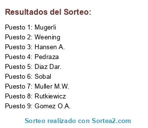 Lista de participantes: De la Fuente , Diaz Dar. , Gomez O.A. , Kurniawan K. , Miller , Mugerli , Muller M.W. , Oyarzun , Pedraza , Rutkiewicz , Sobal , Marque , Knees , Hansen A. , Weening.
