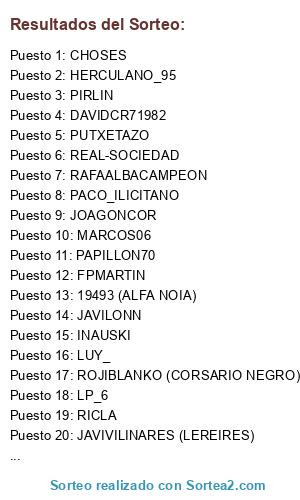 Lista de participantes: JAVIVILINARES (LEREIRES), FPMARTIN, RAFAALBACAMPEON, REAL-SOCIEDAD, 19493 (ALFA NOIA), JAVILONN, HERCULANO_95, JAVI.PEQUE (MANU), INAUSKI, PACO_ILICITANO, TITOROBERT69, ALDUERFE, JOAGONCOR, PAPILLON70, PIRLIN, LP_6, MARCOS06, ROJIBLANKO (CORSARIO NEGRO), RICLA, XESCO, CHOSES, DAVIDCR71982, --ZUMBON, PUTXETAZO, LUY_, EKIPO OFICIAL DEL FORO.