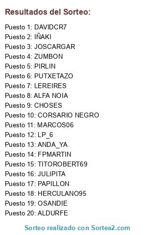 Lista de participantes: HERCULANO95, FPMARTIN, DAVIDCR7, ANDA_YA, ALFA NOIA, ZUMBON, ALDURFE, IÑAKI, JULIPITA, LP_6, PUTXETAZO, TITOROBERT69, PIRLIN, OSANDIE, PAPILLON, CORSARIO NEGRO, CHOSES, MARCOS06, JOSCARGAR, LEREIRES.