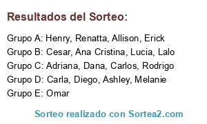 Lista de participantes: Adriana, Carla, Allison, Lalo, Renatta, Ashley, Dana, Omar, Melanie, Diego, Erick, Cesar, Ana Cristina, Rodrigo, Lucia, Henry, Carlos.