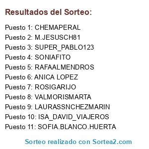 Lista de participantes: VALMORISMARTA, ISA_DAVID_VIAJEROS, ANICA LOPEZ, ROSIGARIJO, SONIAFITO, LAURASSNCHEZMARIN, CHEMAPERAL, SOFIA.BLANCO.HUERTA, SUPER_PABLO123, M.JESUSCH81, RAFAALMENDROS.