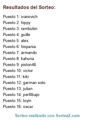 Lista de participantes: piston46, hispania, kahuna, perfilbajo, loyin, julian, guille, alex, victor, ivanovich, rambukin, german soto, hippy, kiki, oscar, armando.