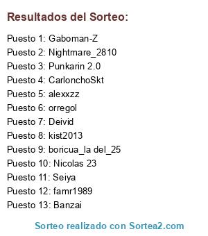 Lista de participantes: alexxzz, Banzai, boricua_la del_25, CarlonchoSkt, Deivid, famr1989, Gaboman-Z, kist2013, Nicolas 23, Nightmare_2810, orregol, Punkarin 2.0, Seiya, .