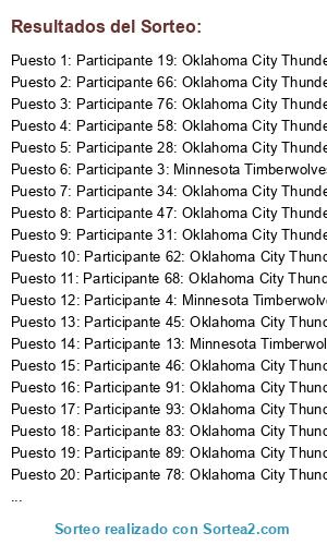 Lista de participantes: Participante 1: Minnesota Timberwolves, Participante 2: Minnesota Timberwolves, Participante 3: Minnesota Timberwolves, Participante 4: Minnesota Timberwolves, Participante 5: Minnesota Timberwolves, Participante 6: Minnesota Timberwolves, Participante 7: Minnesota Timberwolves, Participante 8: Minnesota Timberwolves, Participante 9: Minnesota Timberwolves, Participante 10: Minnesota Timberwolves, Participante 11: Minnesota Timberwolves, Participante 12: Minnesota Timberwolves, Participante 13: Minnesota Timberwolves, Participante 14: Minnesota Timberwolves, Participante 15: Oklahoma City Thunder, Participante 16: Oklahoma City Thunder, Participante 17: Oklahoma City Thunder, Participante 18: Oklahoma City Thunder, Participante 19: Oklahoma City Thunder, Participante 20: Oklahoma City Thunder, Participante 21: Oklahoma City Thunder, Participante 22: Oklahoma City Thunder, Participante 23: Oklahoma City Thunder, Participante 24: Oklahoma City Thunder, Participante 25: Oklahoma City Thunder, Participante 26: Oklahoma City Thunder, Participante 27: Oklahoma City Thunder, Participante 28: Oklahoma City Thunder, Participante 29: Oklahoma City Thunder, Participante 30: Oklahoma City Thunder, Participante 31: Oklahoma City Thunder, Participante 32: Oklahoma City Thunder, Participante 33: Oklahoma City Thunder, Participante 34: Oklahoma City Thunder, Participante 35: Oklahoma City Thunder, Participante 36: Oklahoma City Thunder, Participante 37: Oklahoma City Thunder, Participante 38: Oklahoma City Thunder, Participante 39: Oklahoma City Thunder, Participante 40: Oklahoma City Thunder, Participante 41: Oklahoma City Thunder, Participante 42: Oklahoma City Thunder, Participante 43: Oklahoma City Thunder, Participante 44: Oklahoma City Thunder, Participante 45: Oklahoma City Thunder, Participante 46: Oklahoma City Thunder, Participante 47: Oklahoma City Thunder, Participante 48: Oklahoma City Thunder, Participante 49: Oklahoma City Thunder, Participante 50: Oklahoma City Thunder, Participante 51: Oklahoma City Thunder, Participante 52: Oklahoma City Thunder, Participante 53: Oklahoma City Thunder, Participante 54: Oklahoma City Thunder, Participante 55: Oklahoma City Thunder, Participante 56: Oklahoma City Thunder, Participante 57: Oklahoma City Thunder, Participante 58: Oklahoma City Thunder, Participante 59: Oklahoma City Thunder, Participante 60: Oklahoma City Thunder, Participante 61: Oklahoma City Thunder, Participante 62: Oklahoma City Thunder, Participante 63: Oklahoma City Thunder, Participante 64: Oklahoma City Thunder, Participante 65: Oklahoma City Thunder, Participante 66: Oklahoma City Thunder, Participante 67: Oklahoma City Thunder, Participante 68: Oklahoma City Thunder, Participante 69: Oklahoma City Thunder, Participante 70: Oklahoma City Thunder, Participante 71: Oklahoma City Thunder, Participante 72: Oklahoma City Thunder, Participante 73: Oklahoma City Thunder, Participante 74: Oklahoma City Thunder, Participante 75: Oklahoma City Thunder, Participante 76: Oklahoma City Thunder, Participante 77: Oklahoma City Thunder, Participante 78: Oklahoma City Thunder, Participante 79: Oklahoma City Thunder, Participante 80: Oklahoma City Thunder, Participante 81: Oklahoma City Thunder, Participante 82: Oklahoma City Thunder, Participante 83: Oklahoma City Thunder, Participante 84: Oklahoma City Thunder, Participante 85: Oklahoma City Thunder, Participante 86: Oklahoma City Thunder, Participante 87: Oklahoma City Thunder, Participante 88: Oklahoma City Thunder, Participante 89: Oklahoma City Thunder, Participante 90: Oklahoma City Thunder, Participante 91: Oklahoma City Thunder, Participante 92: Oklahoma City Thunder, Participante 93: Oklahoma City Thunder, Participante 94: Oklahoma City Thunder, Participante 95: Oklahoma City Thunder, Participante 96: Oklahoma City Thunder, Participante 97: Oklahoma City Thunder, Participante 98: Oklahoma City Thunder.