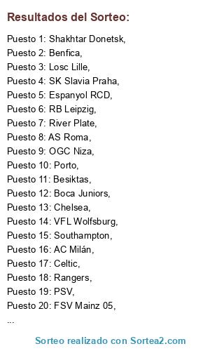 Lista de participantes: AC Milán,, AS Roma,, Benfica,, Besiktas,, Boca Juniors,, Celtic,, Chelsea,, Espanyol RCD,, Fenerbahçe SK,, FSV Mainz 05,, Hoffenheim,, Losc Lille,, Monterrey,, OGC Niza,, Porto,, PSV,, Rangers,, RB Leipzig,, River Plate,, Shakhtar Donetsk,, SK Slavia Praha,, Southampton,, Vélez Sarfield,, VFL Wolfsburg,.