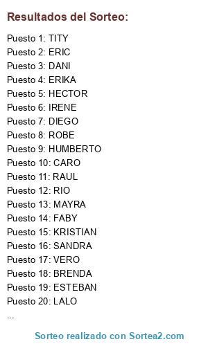 Lista de participantes: ERIC(1), RAUL(1), RIO(1), SANDRA(1), ERIKA(1), LALO(1), HECTOR(1), TITY(1), DIEGO(1), HUMBERTO(1), ROBE(1), VERO(1), IRENE(1), KRISTIAN(1), MAYRA(1), CARO(1), DANI(1), BRENDA(1), SERGIO(1), ESTEBAN(1), FABY(1), MAYE(1).