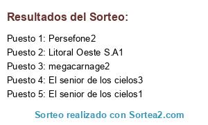 Lista de participantes: f3R_gt1, f3R_gt2, f3R_gt3, f3R_gt4, f3R_gt5, Faleonz1, Persefone1, Persefone2, phigas31, phigas32, phigas33, phigas34, phigas35, Anibal19811, Anibal19812, El senior de los cielos1, El senior de los cielos2, El senior de los cielos3, El senior de los cielos4, El senior de los cielos5, megacarnage1, megacarnage2, megacarnage3, megacarnage4, megacarnage5, Litoral Oeste S.A1, Chukamika1, Chukamika2, Chukamika3, Chukamika4, Chukamika5, Pablo Schnyder1, Pablo Schnyder2, Pablo Schnyder3, Pablo Schnyder4, Pablo Schnyder5.