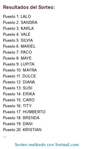 Lista de participantes: KRISTIAN, ERIKA, KARLA, MARIEL, BRENDA, CARO, TITY, VALE, SILVIA, MAYRA, SUSI, HUMBERTO, DIANA, PACO, LALO, SANDRA, DULCE, NATY, LUPITA, MAYE, DANI.