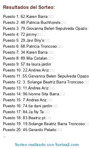 Lista de participantes: 1.Seba Muñoz✔️, 2.Seba Muñoz✔️, 3. Solange Beatriz Barra Troncoso✔️, 4.Geraldine Ortiz✔️, 5.Javi Bny's✔️, 6.Seba Muñoz✔️, 7.Andres Ariz✔️, 8.Joan Nuñez✔️, 9 Gerardo Pelaito✔️, 10.Andres Ariz✔️, 11.Andres Ariz✔️, 12. Gerardo Pelaito✔️, 13. Kote Ammour Lopez✔️, 14.Isadora Latorre Barra✔️, 15.seba barra✔️, 16.Geraldine Ortiz✔️, 17.Leito Lobito USM✔️, 18.Tio Toño✔️, 19.Solange Beatriz Barra Troncoso✔️, 20. Astrid Vanessa ✔️, 21.Juan Pinto✔️, 22.Andres Ariz✔️, 23.Geraldine Ortiz✔️, 24.Geraldine Ortiz✔️, 25.Leito Lobito USM✔️, 26.Andres Aris✔️, 27.Giovanna Belen Sepulveda Opazo✔️, 28.Patricia Troncoso✔️, 29.Javi Bny's✔️, 30.Ricky USM ✔️, 31.Carmen Gloria Merino✔️, 34.Karen Barra✔️, 35.Paula Elicer Labraña, 36.Juan Pinto✔️, 37.Kike Yaya✔️, 38. Beatriz Pt✔️, 39.Juan Pinto✔️, 40.Seba Muñoz✔️, 41.Cecy Olave, 42.jimmy✔️, 43.Isadora Latorre Barra✔️, 44.Tio toño✔️, 45.Gerardo Pelaito✔️, 46. Tia caro jardin, 48.Patricia Buchhorsts✔️, 49.Rocío Belén Díaz Pɞ✔️, 50.Emilio Cordero✔️, 51.Cecy Olave, 52.Marcela Astudillo Vega, 53.tia dani jardin✔️, 54.Ja Ny Ta✔️, 55.Giovanna Belen Sepulveda Opazo✔️, 57.tia laura jardin, 58.Patricia Troncoso✔️, 59. Tia dani jardin✔️, 60.Seba Muñoz✔️, 61.Cecy Olave, 62.Karen Barra✔️, 65.Giovanna Belen Sepulveda Opazo✔️, 68.Patricia Troncoso✔️, 69.Ivonne Sita Barra✔️, 70.Alejandra Patricia Buchhorsts✔️, 71.Mia Catalan✔️, 72.jimmy✔️, 73.Ivonne Sita Barra✔️, 74.tia dani jardin✔️, 75. Tia andrea jardin✔️, 76.Jessica Cordero✔️, 77.Leito Lobito Usm✔️, 78.Patricia Troncoso✔️, 79.Giovanna Belen Sepulveda Opazo✔️, 80.Tio Toño✔️, 81.Mia Catalan✔️, 82.tia dani jardin✔️, 83.Beatriz pt✔️, 84.Ja Ny Ta✔️, 85.Jessica Cordero✔️, 86.tia valeria jardin, 87.tia clari jardin✔️, 88.Macarena Zagal✔️, 89.Mia Catalan✔️, 90.Tio Toño✔️, 91.Mia Catalan✔️, 92.Mia Catalan ✔️, 93.Giovanna Belen Sepulveda Opazo✔️, 96.Ivonne Sita Barra✔️, 97.tia dani jardin✔️, 98.Patricia Troncoso✔️, 99. Ricky Usm✔️, 100.Geraldine Ortiz✔️.