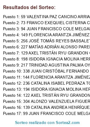 Lista de participantes: 1 BASTIÁN PATRICIO ALARCÓN FUENTES, 11 LUCAS SIMÓN ARAVENA ESCOBAR, 21 MATÍAS EDUARDO ÁVILA ESPINOZA, 31 MATEO ISAÍAS BAEZ VALENZUELA, 41 AGUSTÍN ALONSO BURGOS RAMÍREZ, 51 VALENTINA PAZ CANCINO ARRIAGADA, 61 DANIELA AGUSTINA CEA FERNÁNDEZ, 71 FRANCO EXEQUIEL CISTERNA CASTILLO, 81 ARIADNA PAZ CISTERNAS QUINTEROS, 91 JUAN FRANCISCO COLE MELGAREJO, 101 JOSEFA AGUSTINA CONTRERAS LARA, 111 JOSEFA IGNACIA GARCES CUEVAS, 121 AXEL TRISTÁN RYU GRANDON CARRASCO, 131 CATALINA ANDREA HENRÍQUEZ NOGRARO, 141 FLORENCIA ARANTZA JIMÉNEZ CARRASCO, 151 AGUSTÍN ANDRÉS JOFRÉ SANHUEZA, 161 GOETHE NICOLÁS LAGOS ESCOBAR, 171 ANGEL ANTONIO AGUSTÍN LOBOS BETANCOUR, 181 SOFÍA PAZ LUENGO HENRÍQUEZ, 191 ISIDORA IGNACIA MOLINA HERRERA, 201 MARÍA JOSÉ PAILLALEF SAN MARTÍN, 211 TRINIDAD AGUSTINA PALMA OYARZO, 221 MATÍAS ADRIÁN ALONSO PAREDES ÁLVAREZ, 231 CATALINA ISABEL PEDRAZA TORRES, 241 SEBASTIÁN FELIPE RAMOS PÉREZ, 251 JOSÉ TOMÁS REYES BASSALETTI, 261 RICARDO ALEXANDER REYES MARTÍNEZ, 271 FLORENCIA IGNACIA ROBLES HERNÁNDEZ, 281 IGNACIO ALEJANDRO SANHUEZA FIGUEROA, 291 JAVIERA IGNACIA SANTANDER GARCÉS, 301 ALONZO VALENZUELA FIGUEROA, 311 FRANCISCA PASCAL VÁSQUEZ BARAHONA, 321 TRINIDAD CAROLINA VENEGAS CRUZ, 331 JUAN CRISTÓBAL FERNANDO VENEGAS SAN JUAN, 2 BASTIÁN PATRICIO ALARCÓN FUENTES, 12 LUCAS SIMÓN ARAVENA ESCOBAR, 22 MATÍAS EDUARDO ÁVILA ESPINOZA, 32 MATEO ISAÍAS BAEZ VALENZUELA, 42 AGUSTÍN ALONSO BURGOS RAMÍREZ, 52 VALENTINA PAZ CANCINO ARRIAGADA, 62 DANIELA AGUSTINA CEA FERNÁNDEZ, 72 FRANCO EXEQUIEL CISTERNA CASTILLO, 82 ARIADNA PAZ CISTERNAS QUINTEROS, 92 JUAN FRANCISCO COLE MELGAREJO, 102 JOSEFA AGUSTINA CONTRERAS LARA, 112 JOSEFA IGNACIA GARCES CUEVAS, 122 AXEL TRISTÁN RYU GRANDON CARRASCO, 132 CATALINA ANDREA HENRÍQUEZ NOGRARO, 142 FLORENCIA ARANTZA JIMÉNEZ CARRASCO, 152 AGUSTÍN ANDRÉS JOFRÉ SANHUEZA, 162 GOETHE NICOLÁS LAGOS ESCOBAR, 172 ANGEL ANTONIO AGUSTÍN LOBOS BETANCOUR, 182 SOFÍA PAZ LUENGO HENRÍQUEZ, 192 ISIDORA IGNACIA MOLINA HERRERA, 202 MARÍA JOSÉ PAILLALEF SAN MARTÍN, 212 TRINIDAD AGUSTINA PALMA OYARZO, 222 MATÍAS ADRIÁN ALONSO PAREDES ÁLVAREZ, 232 CATALINA ISABEL PEDRAZA TORRES, 242 SEBASTIÁN FELIPE RAMOS PÉREZ, 252 JOSÉ TOMÁS REYES BASSALETTI, 262 RICARDO ALEXANDER REYES MARTÍNEZ, 272 FLORENCIA IGNACIA ROBLES HERNÁNDEZ, 282 IGNACIO ALEJANDRO SANHUEZA FIGUEROA, 292 JAVIERA IGNACIA SANTANDER GARCÉS, 302 ALONZO VALENZUELA FIGUEROA, 312 FRANCISCA PASCAL VÁSQUEZ BARAHONA, 322 TRINIDAD CAROLINA VENEGAS CRUZ, 332 JUAN CRISTÓBAL FERNANDO VENEGAS SAN JUAN, 3 BASTIÁN PATRICIO ALARCÓN FUENTES, 13 LUCAS SIMÓN ARAVENA ESCOBAR, 23 MATÍAS EDUARDO ÁVILA ESPINOZA, 33 MATEO ISAÍAS BAEZ VALENZUELA, 43 AGUSTÍN ALONSO BURGOS RAMÍREZ, 53 VALENTINA PAZ CANCINO ARRIAGADA, 63 DANIELA AGUSTINA CEA FERNÁNDEZ, 73 FRANCO EXEQUIEL CISTERNA CASTILLO, 83 ARIADNA PAZ CISTERNAS QUINTEROS, 93 JUAN FRANCISCO COLE MELGAREJO, 103 JOSEFA AGUSTINA CONTRERAS LARA, 113 JOSEFA IGNACIA GARCES CUEVAS, 123 AXEL TRISTÁN RYU GRANDON CARRASCO, 133 CATALINA ANDREA HENRÍQUEZ NOGRARO, 143 FLORENCIA ARANTZA JIMÉNEZ CARRASCO, 153 AGUSTÍN ANDRÉS JOFRÉ SANHUEZA, 163 GOETHE NICOLÁS LAGOS ESCOBAR, 173 ANGEL ANTONIO AGUSTÍN LOBOS BETANCOUR, 183 SOFÍA PAZ LUENGO HENRÍQUEZ, 193 ISIDORA IGNACIA MOLINA HERRERA, 203 MARÍA JOSÉ PAILLALEF SAN MARTÍN, 213 TRINIDAD AGUSTINA PALMA OYARZO, 223 MATÍAS ADRIÁN ALONSO PAREDES ÁLVAREZ, 233 CATALINA ISABEL PEDRAZA TORRES, 243 SEBASTIÁN FELIPE RAMOS PÉREZ, 253 JOSÉ TOMÁS REYES BASSALETTI, 263 RICARDO ALEXANDER REYES MARTÍNEZ, 273 FLORENCIA IGNACIA ROBLES HERNÁNDEZ, 283 IGNACIO ALEJANDRO SANHUEZA FIGUEROA, 293 JAVIERA IGNACIA SANTANDER GARCÉS, 303 ALONZO VALENZUELA FIGUEROA, 313 FRANCISCA PASCAL VÁSQUEZ BARAHONA, 323 TRINIDAD CAROLINA VENEGAS CRUZ, 333 JUAN CRISTÓBAL FERNANDO VENEGAS SAN JUAN, 4 BASTIÁN PATRICIO ALARCÓN FUENTES, 14 LUCAS SIMÓN ARAVENA ESCOBAR, 24 MATÍAS EDUARDO ÁVILA ESPINOZA, 34 MATEO ISAÍAS BAEZ VALENZUELA, 44 AGUSTÍN ALONSO BURGOS RAMÍREZ, 54 VALENTINA PAZ CANCINO ARRIAGADA, 64 DANIELA AGUSTINA CEA FERNÁNDEZ, 74 FRANCO EXEQUIEL CISTERNA CASTILLO, 84 ARIADNA PAZ CISTERNAS QUINTEROS, 94 JUAN FRANCISCO COLE MELGAREJO, 104 JOSEFA AGUSTINA CONTRERAS LARA, 114 JOSEFA IGNACIA GARCES CUEVAS, 124 AXEL TRISTÁN RYU GRANDON CARRASCO, 134 CATALINA ANDREA HENRÍQUEZ NOGRARO, 144 FLORENCIA ARANTZA JIMÉNEZ CARRASCO, 154 AGUSTÍN ANDRÉS JOFRÉ SANHUEZA, 164 GOETHE NICOLÁS LAGOS ESCOBAR, 174 ANGEL ANTONIO AGUSTÍN LOBOS BETANCOUR, 184 SOFÍA PAZ LUENGO HENRÍQUEZ, 194 ISIDORA IGNACIA MOLINA HERRERA, 204 MARÍA JOSÉ PAILLALEF SAN MARTÍN, 214 TRINIDAD AGUSTINA PALMA OYARZO, 224 MATÍAS ADRIÁN ALONSO PAREDES ÁLVAREZ, 234 CATALINA ISABEL PEDRAZA TORRES, 244 SEBASTIÁN FELIPE RAMOS PÉREZ, 254 JOSÉ TOMÁS REYES BASSALETTI, 264 RICARDO ALEXANDER REYES MARTÍNEZ, 274 FLORENCIA IGNACIA ROBLES HERNÁNDEZ, 284 IGNACIO ALEJANDRO SANHUEZA FIGUEROA, 294 JAVIERA IGNACIA SANTANDER GARCÉS, 304 ALONZO VALENZUELA FIGUEROA, 314 FRANCISCA PASCAL VÁSQUEZ BARAHONA, 324 TRINIDAD CAROLINA VENEGAS CRUZ, 334 JUAN CRISTÓBAL FERNANDO VENEGAS SAN JUAN, 5 BASTIÁN PATRICIO ALARCÓN FUENTES, 15 LUCAS SIMÓN ARAVENA ESCOBAR, 25 MATÍAS EDUARDO ÁVILA ESPINOZA, 35 MATEO ISAÍAS BAEZ VALENZUELA, 45 AGUSTÍN ALONSO BURGOS RAMÍREZ, 55 VALENTINA PAZ CANCINO ARRIAGADA, 65 DANIELA AGUSTINA CEA FERNÁNDEZ, 75 FRANCO EXEQUIEL CISTERNA CASTILLO, 85 ARIADNA PAZ CISTERNAS QUINTEROS, 95 JUAN FRANCISCO COLE MELGAREJO, 105 JOSEFA AGUSTINA CONTRERAS LARA, 115 JOSEFA IGNACIA GARCES CUEVAS, 125 AXEL TRISTÁN RYU GRANDON CARRASCO, 135 CATALINA ANDREA HENRÍQUEZ NOGRARO, 145 FLORENCIA ARANTZA JIMÉNEZ CARRASCO, 155 AGUSTÍN ANDRÉS JOFRÉ SANHUEZA, 165 GOETHE NICOLÁS LAGOS ESCOBAR, 175 ANGEL ANTONIO AGUSTÍN LOBOS BETANCOUR, 185 SOFÍA PAZ LUENGO HENRÍQUEZ, 195 ISIDORA IGNACIA MOLINA HERRERA, 205 MARÍA JOSÉ PAILLALEF SAN MARTÍN, 215 TRINIDAD AGUSTINA PALMA OYARZO, 225 MATÍAS ADRIÁN ALONSO PAREDES ÁLVAREZ, 235 CATA