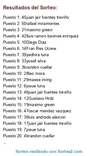 Lista de participantes: 1brandon cuellar, 2brandon cuellar, 3brandon cuellar, 4brandon cuellar, 5josue luna, 6josue luna, 7josue luna, 8josue luna, 9Diego Diaz, 10Diego Diaz, 11Gustavo Hrdz, 12Gustavo Hrdz, 13Fran Res Ucrew, 14Fran Res Ucrew, 15Fran Res Ucrew, 16Fran Res Ucrew, 17juan jair fuentes treviño, 18juan jair fuentes treviño, 19maximo green, 20maximo green, 21maximo green, 22maximo green, 23mauricio resendiz, 24mauricio resendiz, 25alexandra solache villalpando, 26alexandra solache villalpando, 27leo mora, 28leo mora, 29maese irving, 30maese irving, 31maese irving, 32maese irving, 33yosef silva, 34yosef silva, 35luis andrade alarcon, 36luis andrade alarcon, 37luis andrade alarcon, 38luis andrade alarcon, 39yadhira luna, 40yadhira luna, 41lluis ramon bavines enriquez, 42lluis ramon bavines enriquez, 43erik gonzalez, 44erik gonzalez, 45juan jair fuentes treviño, 46juan jair fuentes treviño, 47oscar mendez vazquez, 48oscar mendez vazquez, 49rafael miramontes, 50rafael miramontes.