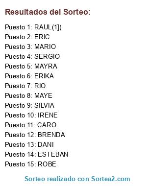 Lista de participantes: ROBE(1), RIO(1), ESTEBAN(1), CARO(1), IRENE(1), MAYRA(1), SILVIA(1), DANI(1), ERIKA(1), ERIC(1), RAUL(1]), MAYE(1), SERGIO(1), MARIO(1), BRENDA(1).