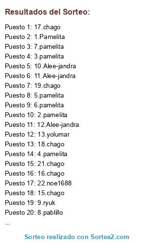 Lista de participantes: 1.Pamelita, 2.pamelita, 3.pamelita, 4.pamelita, 5.pamelita, 6.pamelita, 7.pamelita, 8.pablillo, 9.ryuk, 10.Alee-jandra, 11.Alee-jandra, 12.Alee-jandra, 13.yolumar, 14.bon, 15.chago, 16.chago, 17.chago, 18.chago, 19.chago, 20.chago, 21.chago, 22.noe1688.