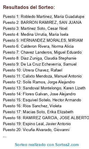 Lista de participantes: Herrera Silva, Fidel Adrian(2), BALDERAS SANCHEZ, JAZMIN SELENE(1), DIONICIO MERINO, PATRICIA(1), Garcia Beltran, Ana Karina(4), RAMIREZ BADILLO, BRENDA ALINE(4), LOMAS BERMUDEZ, OSCAR(5), BUENDIA RAYOS, MARINA(2), ALVARADO PEREZ, PATRICIA(1), MANCHA ALCALA, FABIOLA LIZETH(3), GARCIA AVALOS, ANGELICA PAOLA(4), REYES CORONA, XOCHITL(1), VARGAS RAMIREZ, EVERARDO(3), Utrera Chavez, Rafael(5), HERNANDEZ DURAN, SILVIA VIRIDIANA(3), ALBA RODRIGUEZ, NANCY ESTELA(5), ROCHA BELTRAN, RUTH(4), Escobedo Lopez, Rodolfo Alfredo(9), PEREZ JIMENEZ, MARIA DEL PILAR(4), RODRIGUEZ HERNANDEZ, ESPERANZA(2), SOLIS CASTILLO, SANDRA(3), MONTELONGO GUTIERREZ, BLANCA GRISEL(2), HEREDIA NEPOMUCENO, ANIBAL(7), Hernandez Sanchez, Raymundo(11), SAUCEDO ROMERO, JOSE ERASMO(2), Campos Villanueva, Manuel de Jesus(5), RAMIREZ GARCIA, JOSE ALBERTO(3), ORTEGA RAMOS, JESUS DAVID(4), BARRIENTOS GOMEZ , EFRAIN(6), MORALES CASIMIRO, CARLOS(3), HERNANDEZ ALVARADO, DANIEL RICARDO(5), MORALES GOMEZ, CEILA GUADALUPE(9), HERNANDEZ MORALES, MIRIAM(7), MARTINEZ MARTINEZ, JOSE IVAN(3), ROBLERO CASH, ARTURO VIDAL(4), RAMIREZ GALARZA, FIDEL(1), PEREZ JIMENEZ, MARIA ALEJANDRA(14), QUINONEZ ECHEVERRIA, MARIA DE LOURD(2), BARRON RAMIREZ, SAN JUANA(9), VILLA LOZANO, MARTHA ISABEL(5), SILVA VILLA, MARIA DEL CARMEN(7), Esparza Trejo, Juan Gerardo(3), Hernandez Orozco, Juan Manuel(5), ORTEGA ZARCO, ROSALBA(2), Alvarado Alvarez, Brenda Berenice(4), CARRILLO VALLES, ANA CECILIA(1), AGUIRRE , OLGA(8), Zamora , Maria Patricia(2), Adame Hernandez, Karla Karina(7), Monarrez Quezada, Hector Eduardo(5), Rodriguez Esquivel, Yuriana(1), Montalvo Merino, Ivan(8), Castro Gallardo, Clarisa Isabel(3), Velazquez Molina, Edith(1), Delgado Medina, Oscar Jared(5), Bretado Valdenebro, Brenda Esperanz(2), Robledo Martinez, Maria Guadalupe(3), Rodriguez Roque, Gabriela(6), Reyes Zuniga, Petra(1), Devora Contreras, Rafaela(7), Garay Hernandez, Fabiola Yazmin(5), Camacho Bustos, MA Virginia(2), Calderon Aragon, Leticia(2), Ostos Perez, Jose Braulio(7), Gonzalez Fierro, Juan Antonio(5), Morales Gonzalez, Julia(2), Martinez Hernandez, Sergio(1), Toto Seba, Maria Alejandra(13), Cruz Antele, Luis Alberto(4), Reyes Ortiz, Jesus David Luis(6), Lobato Mauricio, Luis Fernando(5), ESPINOZA MENDEZ, MANUEL DE JESUS(3), Rios Velazquez, Luis Antonio(2), Jacquez Gomez, Julio(5), Hipolito Margarito, David(7), Reyes Torres, Esther Macrina(5), Solis Castillo, Alberto(3), Gonzalez Chavez, Sonia(5), De Santiago Rodarte, Dora(3), Medina Ramirez, Ma Silviana(3), Rivera Gonzalez, Ariam(1), Gallegos Morales, Juana Maria(1), Aquino Hernandez, Ruben Daniel(3), Lechuga Sinaloa, Maria de los Angel(5), Gomez Lozano, Magali(4), Sanchez Sanchez, Ruben(3), Renteria Perez, Martin Lorenzo(1), Montes Marquez, Veronica(3), Velazquez Ibarra, Yxiar Nayeli(5), Diaz Olvera, Mayra Guadalupe(1), Fierro Payan, Alma Leticia(2), Vazquez Ruiz, Alma Delia(7), PEREZ , NORMA ANGELICA(6), Becerra Villegas, Margarita(4), Mendez Barahona, Rocio(3), Orta Becerra, Brillit Adriana(1), Gomez Toala, Gabriela(2), Rivera Martinez, Yolanda(1), Rodriguez Dorado, Rosa Maria(1), Marquez Hernandez, Jorge Brayan(2), Gutierrez Alcala, Miguel Adolfo(1), Garcia Villa, Conrado Humberto(3), Castro Moran, Armando(5), Avila Ontiveros, Gabriel Alejandro(5), Moreno Cardona, Susana(1), Rivas Espino, Diana Alejandra(3), Chavez Landeros, Miguel Eduardo(8), Gomez Hernandez, Cristal Vanessa(12), Medina Amparan, Jose Salvador(2), Jaramillo Gallegos, Gabriel(4), Lopez Villalba, Blanca Estela(5), Guzman Perez, Julio(5), Estupinan Sanchez, Jesus Zenaido(5), Soto Hernandez, Ana Maria(5), Soto Hernandez, Andres(5), Davila Reyes, Juan(8), Rios Sanchez, Violeta(12), Lopez Valenzuela, Carlos(12), Narcizo Heredia, Gustavo(9), Castrellon Diaz, Manuel Alexis(1), Mendez Chan, Alejandro(3), Vitela Zuniga, Raul Omar(1), Mayoral Herrera, Nayely Guadalupe(5), Martinez Reyes, Paulina(5), Lara Betancourt, Guadalupe(1), Sarinana Argomaniz, Saul Alfredo(3), Rosas Peralta, Jose Luis(8), Reyes Alvarado, Olga Livia(1), Vazquez Rita, Juventina(5), Ramos Medina, Edith(1), Vargas Cruz, Alejandra(10), Camacho Fausto, Heriberto(6), Ramirez Caldera, Mauricio(2), Alcala Perez, Ilse Sugey(2), Carrera Juan, Adriana(7), Alvarado Ledesma, Ariel Joel(2), Lopez Morones, Dora Alicia(1), Martinez Ramos, Maria Isabel(1), Retana Decena, Alvaro Daniel(2), Salcido Molina, Susana Gabriela(8), Beltran Garcia, Cristina Ivonne(4), Salas Marin, Luis Daniel(1), Aguilera Mauricio, Ismael(4), Garcia Hernandez, Jose Manuel(2), Beltran Mendez, Jesus Jose(5), Lopez Valles, Iris Alejandra(4), Campos Herrera, Francisco Javier(1), Hernandez Hernandez, Jose Darwin(4), Murillo Martinez, Oscar(5), Romero Castro, Fernando(8), Hernandez Maldonado, Sergio(3), Suarez Gutierrez, Karen Jasmin(2), Chima Lopez, Jose Guadalupe(5), Roque Melchi, Ricardo(5), Ramos Terry, Lucia(4), Rodriguez Camacho, Rebeca(2), Calderon Rivera, Norma Alicia(2), Vera Loera, Roxana Arlethe(8), Lucero Favela, Luis(6), Flores Mejia, Maria de los Angeles(6), Calvillo Rodriguez, Maria Catalina(1), Mejia Delgado, Cesar(3), Barron Amaya, Marivel(1), Silva Valdepeñas, Tania Griselda(3), Vicuña Alvarado, Giovanni(3), Moreno Gomez, Adrian Emilio(7), Fiscal Delgado, Areli Del Carmen(2), MENDEZ DE JESUS, YULMA(1), Quintana Ochoa, David(4), Fernandez Arambula, Edgar Omar(7), Montalvo Espinosa, Carmina(4), Martinez Santacruz, Roberto Alonso(10), Hernandez Rodriguez, Daniel(4), Trujillo Rosas, Victor(5), Martinez Lopez, Jany Esmeralda(2), REYES JARAMILLO, DAVID(6), Garcia Rangel, Victor Ignacio(1), Martinez Soto, Cesar Noel(6), Arreola Falcon, Cindia Arleth(1), Alvarado Lopez, Francisco Javier(3), FALCON VALLES, VICTOR MANUEL(3), Rodriguez Valero, Jonathan(2), Hernandez Badillo, Ma. Luz(1), Mora Carranza, Luis Alan(6), Alcantara Puebla, Eder Benjamin(1), Ramirez Lopez, Rosa Eugenia(2), Diaz Custodio, Jaqueline(3), Varela Esparza, Alma Leticia(6), Zamorano Garcia, Ingrid Adriana(1), Ruiz Govea, Norberto(4), Vaquera Salaz
