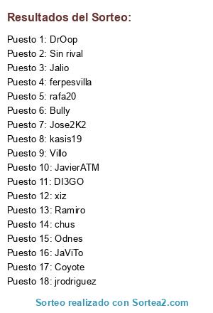 Lista de participantes: JaViTo, Odnes, DrOop, rafa20, Bully, chus, Ramiro, ferpesvilla, Coyote, DI3GO, Jalio, xiz, Villo, jrodriguez, kasis19, JavierATM, Jose2K2, Sin rival.