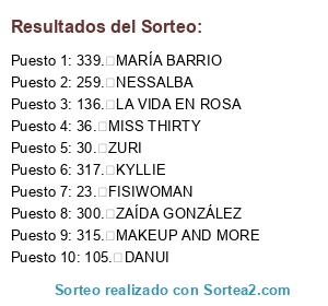 Lista de participantes: 1. SECRETOS DE BELLEZA, 2. SECRETOS DE BELLEZA, 3. SECRETOS DE BELLEZA, 4. AURO11, 5. AURO11, 6. MODE ET TRESSORS, 7. MARIMAR, 8. GADIRROJA, 9. GADIRROJA, 10. GADIRROJA, 11. CALIPSO, 12. CALIPSO, 13. CALIPS, 14. RECIÉN LLEGADA, 15. RECIÉN LLEGADA, 16. MISS POTINGUES, 17. MISS POTINGUES, 18. MISS POTINGUES, 19. NAOKO, 20. NAOKO, 21. NAOKO, 22. FISIWOMAN, 23. FISIWOMAN, 24. 583sg, 25. TORMENTILLA, 26. TORMENTILLA, 27. TORMENTILLA, 28. VIOLETTA, 29. ZURI, 30. ZURI, 31. AMIGAS MAKEUP, 32. AMIGAS MAKEUP, 33. AMIGAS MAKEUP, 34. MISS THIRTY, 35. MISS THIRTY, 36. MISS THIRTY, 37. MOLI ART, 38. MOLI ART, 39. MOLI ART, 40. ROSS, 41. AXIA, 42. AXIA, 43. CASITA DE PIEDRA, 44. CASITA DE PIEDRA, 45. CASITA DE PIEDRA, 46. BECKY, 47. BECKY, 48. BECKY, 49. NIEVES DE JESÚS, 50. NATATXIKI, 51. COSUKI NARU, 52. COSUKI NARU, 53. JENNIFER, 54. LOLA MINE, 55. LOLA MINE, 56. ELISA, 57. ELISA, 58. ELISA, 59. CARMEN FERMIÑÁN, 60. CARMEN FERMIÑÁN, 61. MOSQUETA, 62. MOSQUETA, 63. MAKEUP NYNA, 64. MAKEYP NYNA, 65. MAKEUP NYNA, 66. LUNA ENCAPRICHADA, 67. LUNA ENCAPRICHADA, 68. LUNA ENCAPRICHADA, 69. MIRIAM, 70. MAY, 71. MAY, 72. MAY, 73. ROCCO, 74. ROCCO, 75. ROCCO, 76. FRJZARA, 77. LAXATY KAY, 78. LAXATI KAY, 79. BETTIE, 80. BETTIE, 81. BETTIE, 82. ANUSKA, 83. MY CONSTANT, 84. MAY CONSTANT, 85. ILINTXA, 86. ILINTXA, 87. CRIS ARENAS, 88. CRIS ARENAS, 89. SUPERFICIALES, 90. SUPERFICIALES, 91. SUPERFICIALES, 92. MARIBEL F., 93. MARIBEL F., 94. UN LIEU AVEC ALLURE, 95. UN LIEU AVEC ALLURE, 96. UN LIEU AVEC ALLURE, 97. HEAVEN, 98. HEAVEN, 99. HEAVEN, 100. COOL LIFE, 101. COOL LIFE, 102. COOL LIFE, 103. DANUI, 104. DANUI, 105. DANUI, 106. ¿QUÉ HAY DE NUEVO, AMIGA?, 107. ¿QUÉ HAY DE NUEVO, AMIGA?, 108. YOLANDA AGUADO FLOR, 109. MARISA PALOP, 110. MARISA PALOP, 111. MARISA PALOP, 112. DIANA, 113. DIANA, 114. DIANA, 115. KIRISTINA, 116. GATITA82, 117. GATITA82, 118. LA LOCA DE MILDRED, 119. CRYS, 120. CRYS, 121. CRYS, 122. LA MODA È VITA, 123. LA MODA È VITA, 124. LA MODA È VITA, 125. DRISSING, 126. DRISSING, 127. DRISSING, 128. ANTONIA SEGURA, 129. LA COSMÉTICA DE OLGA, 130. LA COSMÉTICA DE OLGA, 131. LA COSMÉTICA DE OLGA, 132. LAIA FORTUNY, 133. REGALO BEBE, 134. REGALO BEBE, 135. LA VIDA EN ROSA, 136. LA VIDA EN ROSA, 137. VILLA ROSA, 138. PRI SCHIESSI, 139. PRI SCHIESSI, 140. SARA MARTÍNEZ, 141. SARA MARTÍNEZ, 142. ISABEL LOZANO, 143. ISABEL LOZANO, 144. SUSANNA78, 145. HUELE A COCO, 146. HUELE A COCO, 147. EVA CASTELLÓN, 148. EVA CASTELLÓN, 149. RMARTÍNEZ53, 150. GUAPAXI, 151. GUAPAXI, 152. VINTAGE LADY, 153. VINTAGE LADY, 154. CHICA, 155. CHICA, 156. GONDOR TARI, 157. GONDOR TARI, 158. GONDOR TARI, 159. SHIKILANDIA, 160. NAYELI, 161. NAYELI, 162. ENCARI SOLE, 163. ENCARI SOLE, 164. ENCARNI SOLE, 165. SIROCOX, 166. SIROCOX, 167. XANDRA, 168. XANDRA, 169. XANDRA, 170. PONTE GUAPA, 171. PONTE GUAPA, 172. LA NIÑA MARIPOSA, 173. LA NIÑA MARIPOSA, 174. LA NIÑA MARIPOSA, 175. POPON GARCÍA, 176. POPÓN GARCÍA, 177. LADY MADRID, 178. EVAFR, 179. OLGA S, 180. CUTLERÍA, 181. SIRIA, 182. SIRIA, 183. SIRIA, 184. LAURA VM17, 185. ISA, 186. RACHEL SWEET, 187. RACHEL SWEET, 188. ANDREA SUÉREZ, 189. ANDREA SUÁREZ, 190. VICTORIA CLORES, 191. VICTORIA CLONES, 192. MÓNICA MORAL, 193. MÓNICA MORAL, 194. MÓNICA MORAL, 195. JONOLUN, 196. JONOLUN, 197. POR TU CARA BONITA, 198. POR TU CARA BONITA, 199. POR TU CARA BONITA, 200. EVA G, 201. EVA G, 202. LOLITA, 203. LOLITA, 204. LOLITA, 205. SUKY, 206. SUKY, 207. DESCUBRIENDO ANITAS, 208. DESCUBRIENDO ANITAS, 209. CONFUSIÓN EN MADRID, 210. CONFUSIÓN EN MADRID, 211. CONFUSIÓN EN MADRID, 212. IDAIRA, 213. IDAIRA, 214. LULEE, 215. LULEE, 216. LULEE, 217. LITTLE BUTTERFLY, 218. LITTLE BUTTERFLY, 219. LAS COSITAS DE MABU, 220. LAS COSITAS DE MABU, 221. LAS COSITAS DE MABU, 222. ANA MAKEUP, 223. ANA MAKEUP, 224. ANA MAKEUP, 225. DÉBORAH TG, 226. DÉBORAH TG, 227. ANGELS, 228. WINNY, 229. WINNY, 230. GOLONDRINA28, 231. TARONGER, 232. TARONGER, 233. TULY, 234. MISS SOLER, 235. MISS SOLER, 236. MISS SOLER, 237. DAMBER, 238. DAMBER, 239. ANI C, 240. ANI C., 241. ANI C., 242. REBECA SÁNCHEZ, 243. REBECA SÁNCHEZ, 244. REBECA SÁNCHEZ, 245. KRYSTAL, 246. KRYSTAL, 247. KRYSTAL, 248. NAH, 249. LIVING IN THE CITY, 250. LIVING IN THE CITY, 251. BALTIMORE, 252. AÍDA ARAUJO, 253. AÍDA ARAUJO, 254. AÍDA ARAUJO, 255. PATRIZANA, 256. PATRIZANA, 257. ELISABETH, 258. ELISABETH, 259. NESSALBA, 260. NESSALBA, 261. NESSALBA, 262. JES, 263. ROSA5523, 264. FLORA HANNA, 265. FLORA HANNA, 266. EMMA, 267. EMMA, 268. ACORDIA, 269. ACORDIA, 270. MARIOLA MARIOLA, 271. EVA LÓPEZ, 272. EVA LÓPEZ, 273. FLAMENKITA 11, 274. MAROSA, 275. MLUZ, 276. ALEX, 277. LLUM, 278. MNIEVES, 279. PATTY, 280. PATTY, 281. PATTY, 282. KAMALA, 283. EGO MAKEUP, 284. EGO MAKEUP, 285. EGOMAKEUP, 286. CHOCO CHIC, 287. CHOCO CHIC, 288. CHOCO CHIC, 289. ANDREA PICASA, 290. OBANDINA, 291. OBANDINA, 292. OBANDINA, 293. YOLANDA ROMÁN, 294. YOLANDA ROMÁN, 295. FUNSINO, 296. FUNSINO, 297. SONIA B, 298. SONIA B, 299. AIRESCU, 300. ZAÍDA GONZÁLEZ, 301. ZAÍDA GONZÁLEZ, 302. EVITA TRUJILLO, 303. EVITA TRUJILLO, 304. BELÉN RISCO, 305. KÍMICA, 306. ODAKLESAM, 307. ODAKLESAM, 308. ISA 09, 309. MAKEUP BY MARYLAND, 310. MAKEUP BY MARYLAND, 311. MAKEUP BY MARYLAND, 312. CHAMA-K, 313. AHLAM, 314. AHLAM, 315. MAKEUP AND MORE, 316. MAKEUP AND MORE, 317. KYLLIE, 318. KYLLIE, 319. ANDREA GONZÁLEZ, 320. ANDREA GONZÁLEZ, 321. ANDREA GONZÁLEZ, 322. BEATRIZ MARTÍN, 323. BEATRIZ MARTÍN, 324. BE FASHION BE GLAMOUR, 325. BE FASHION BE GLAMOUR, 326. CARAMELO7, 327. CHICHA, 328. NANALETI, 329. NANALETI, 330. NANALETI, 331. MISIFU BROCHES, 332. MISIFU BROCHES, 333. MISIFU BROCHES, 334. MAR ROSA, 335. MAR ROSA, 336. TERE LINARES, 337. TERE LINARES, 338. MARÍA BARRIO, 339. MARÍA BARRIO, 340. MARÍA BARRIO, 341. LA BRUJA DE AZUL, 342. LABRUJA DE AZUL, 343. BALLONS, 344. KAROL, 345. KAROL, 346. KAROL, 347. MODA ELLE, 348. ISABEL HERNÉNDEZ, 349. ISABEL HERNÁNDEZ, 350. ISABEL HERNÁNDEZ, 351. ANA PROSPER, 352. 