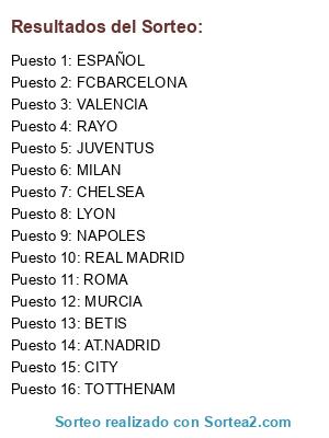 Lista de participantes: NAPOLES, VALENCIA, LYON, FCBARCELONA, CHELSEA, AT.NADRID, JUVENTUS, ROMA, MILAN, BETIS, REAL MADRID, CITY, MURCIA, RAYO, ESPAÑOL, TOTTHENAM.