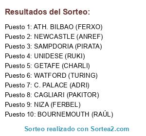 Lista de participantes: BOURNEMOUTH (RAÚL), NEWCASTLE (ANREF), UNIDESE (RUKI), ATH. BILBAO (FERXO), WATFORD (TURING), C. PALACE (ADRI), GETAFE (CHARLI), NIZA (FERBEL), CAGLIARI (PAKITOR), SAMPDORIA (PIRATA).