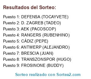 Lista de participantes: FROSINONE (BUDDY), TRANSZONSPOR (HUGO), CÁDIZ (PEPE), ANTWERP (ALEJANDRO), BRESCIA (JUAN), D. ZAGREB (TADEO), AEK (PACOSCOP), DEFENSA (TOCAYVETE), RANGERS (RUBENHINO).