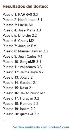 Lista de participantes: Emili Fenoll 3.1, Estrella Galicia 2.2, Miguelon M2, Sergio Corral 2.1, Jota 3.2, El Bicho 2.2, Jaime Joya M2, Francisco Carranco M1, Luka Trunks 3.1, Huracan 3.2, Ayabalo 3.3, Jose manuel flor 3.3, David Pachecho 2.1, Pedro M2, Raul Lopesino 2.1, Juan Carlos M1, Pardeza 3.3, Real Betis 3.3, Gol de casimiro 2.2, Zerrada 3.2, Jose Miguel Sanchez M2, Yban Figueroa 3.1, Rincon 3.4, Romero 2.2, Lucille M1, Manuel Gavilán 2.2, HT-78 2.1, Carlos M1, Suso del Rio 3.1, DABAMU 3.4, Javito Zurdo M2, Saul goodman 3.4, Joaquin FM, Isaam 2.2, Goatleti 2.1, Corleone M1, RaulFord 3.2, Jomicheque 3.2, Juanmi Caballero M1, KARRA9 3.3, CharlyZiZu M1, Sancho Panza M2, Alexpulga M1, Dami 3.2 58, Neefermaat 3.1, Isleño 3.1, anerol05 3.3, quirce24 3.2, Kaxu 2.1, Jota Ezponda M1, SergioMB 3.1, Danimador 3.3, Piru 3.1, Sevi M2, Deivid 2.2, Batigol 3.4, Oscar Mejias M1, Luca Toni 2.1, Aiub 2.1, Jose Maria 3.3, Charly M2, Dr.Edu/The gurú M2, Valladares 3.3, Perico17 2.1.