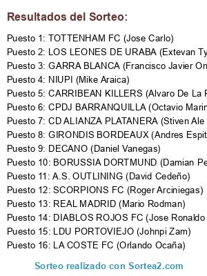 Lista de participantes: CARRIBEAN KILLERS (Alvaro De La Rosa), NIUPI (Mike Araica), DECANO (Daniel Vanegas), GARRA BLANCA (Francisco Javier Onell), DIABLOS ROJOS FC (Jose Ronaldo Vidal), SCORPIONS FC (Roger Arciniegas), GIRONDIS BORDEAUX (Andres Espitia), A.S. OUTLINING (David Cedeño), CPDJ BARRANQUILLA (Octavio Marin), CD ALIANZA PLATANERA (Stiven Ale Licona), LDU PORTOVIEJO (Johnpi Zam), REAL MADRID (Mario Rodman), LOS LEONES DE URABA (Extevan Tyga), LA COSTE FC (Orlando Ocaña), TOTTENHAM FC (Jose Carlo), BORUSSIA DORTMUND (Damian Perea).
