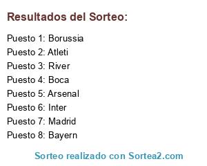 Lista de participantes: Borussia, Bayern, Inter, River, Boca, Arsenal, Madrid, Atleti.