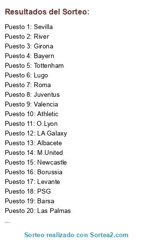 Lista de participantes: Borussia, Getafe, Sevilla, Valencia, Tottenham, At.Madrid, M.United, R.Madrid, River, LA Galaxy, Barsa, Liverpool, Juventus, Bayern, Las Palmas, Eibar, Albacete, City, Betis, Lugo, Newcastle, Napoles, Talleres, Celta, Girona, PSG, Roma, Celtic, Levante, Athletic, Khasima, O.Lyon.