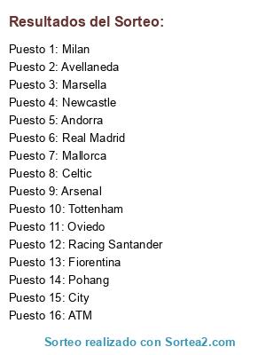 Lista de participantes: City, Andorra, Mallorca, Fiorentina, Tottenham, Celtic, Pohang, Newcastle, Oviedo, Marsella, Arsenal, Real Madrid, Racing Santander, Avellaneda, Milan, ATM.