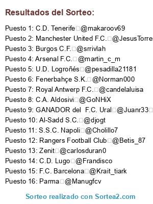Lista de participantes: Fenerbahçe S.K. @Norman000, U.D. Logroñés @pesadilla21181, Zenit @carlosduran0, Parma @Manugfcv, C.D. Lugo @Frandisco, Al-Sadd S.C. @djogt, Royal Antwerp F.C. @candelaluisa, Burgos C.F. @srrivlah, F.C. Barcelona @Krait_tiark, Rangers Football Club @Betis_87, Arsenal F.C. @martin_c_m, Manchester United F.C. @JesusTorress, C.D. Tenerife @makaroov69, C.A. Aldosivi @GoNHiX, S.S.C. Napoli @Cholillo7, GANADOR del F.C. Ural @Juanr33 vs Brøndby IF @bukron00.