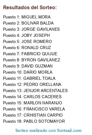 Lista de participantes: RONALD CRUZ, MARLON NARANJO, MIGUEL MORA, FABRICIO QUIJIJE, CARLOS CACERES, PABLO SOTOMAYOR, DARIO MORLA, PEDRO ORELLANA, FRANCISCO VARELA, GABRIEL TOALA, BYRON GAVILANEZ, BOLIVAR BALDA, JOSE ROMERO, DAVID GUZMAN, JENJOR ARCENTALES, CRHISTIAN CARPIO, JORGE GAVILANES, JOBY JOSEPH.