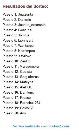 Lista de participantes: AlePGL, Xaviloko, Negri, Emilich, Lionheart, Wantxope, Cadista, Jiliyo, Fista, Daniorlo, Ronierm, Mansino, Jamfus, Sergio_90_gnv, Zeulito, Camandula, Messiano, Euskalplayer, Goar_cai, Jualzurita, Peperecre, Jesure, Luisixu, AlexRamos, Fresco, Malasombra, Kefergas, Soccatala, Jordi25, Ayo, Sergioheras, Lm1989gr, Caubo12, Mateyita, Kharimpool, Juanito_ercambio, PoloVCF, Danitorix, Kaiser-sh7, Pauuu24, Durbe, Migue86, Nyzanes, Monsterinho23, Franchu1234, Torneosgamingluis, Harper7584, Clapped_by_mv.