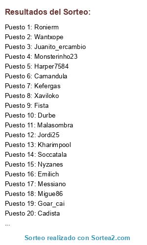 Lista de participantes: AlePGL, Xaviloko, Negri, Emilich, Lionheart, Wantxope, Cadista, Jiliyo, Fista, Daniorlo, Ronierm, Mansino, Jamfus, Sergio_90_gnv, Zeulito, Camandula, Messiano, Euskalplayer, Goar_cai, Jualzurita, Peperecre, Jesure, Luisixu, AlexRamos, Fresco, Malasombra, Kefergas, Soccatala, Jordi25, Ayo, Sergioheras, Lm1989gr, Caubo12, Mateyita, Kharimpool, Juanito_ercambio, PoloVCF, Danitorix, Kaiser-sh7, Pauuu24, Durbe, Migue86, Nyzanes, Monsterinho23, Franchu1234, Torneosgamingluis, Harper7584, Clapped_by_mv.
