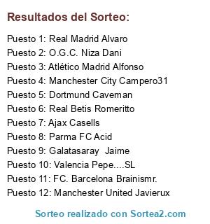 Lista de participantes: FC. Barcelona Brainismr., Valencia Pepe....SL, Manchester United Javierux, Manchester City Campero31, Parma FC Acid, Real Betis Romeritto, Real Madrid Alvaro, O.G.C. Niza Dani, Atlético Madrid Alfonso, Dortmund Caveman, Ajax Casells, Galatasaray Jaime.